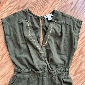 •Colors green with tan embroidery in front of jumpsuit