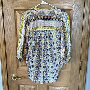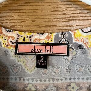 This fun top is made by Olive Hill. It has a great boho feel to it with the mixed print, the loose fit cut and the cute sleeves. Size small and in very nice pre owned condition. Smoke and pet free home.
