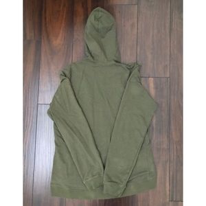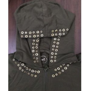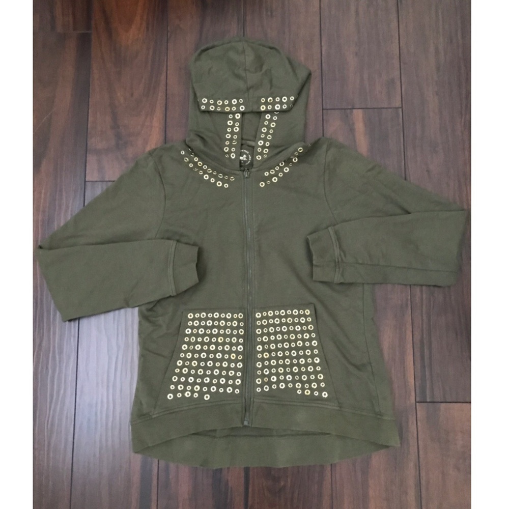 Olive hooded jacket with small gold rings around the outer hood and front pocket. It’s true to the olive color, the picture may look a little darker.