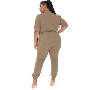 Step into elevated ease with this olive-toned utility jumpsuit designed for both comfort and style. Featuring a relaxed fit with short sleeves, a classic collared neckline, this one-piece wonder is perfect for any occasion. The adjustable drawstring cinches the waist for a flattering silhouette, while functional side pockets and a soft, breathable fabric make it as practical as it is fashionable. Cuffed ankles add a tailored touch, making it easy to dress up with heels or down with sneakers. Whether you’re running errands or meeting friends for brunch, this jumpsuit has you covered.