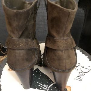 A faux suede boot featuring a harness accent and a faux stacked heel and inner zip closure.