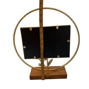 This ornate mirror combines a golden metal circle with olive leaf accents and a sturdy wooden base, creating a sophisticated centerpiece for photos or art.