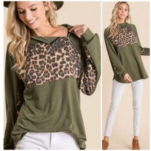Olive green french terry pull over with one side zip up closure at raglan seam and leopard animal printed yoke with sleeve block.