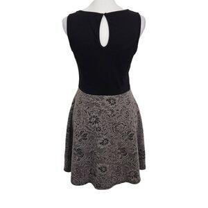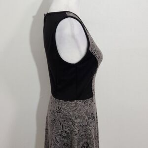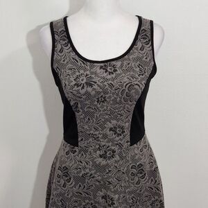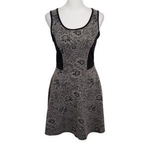 Olive & Oak sleeveless dress. The dress has a fit and flare style, a rounded neckline, and flattering seams. Features a keyhole cutout in back with single button. Fabric is gray and black in a lace floral print. Great condition!