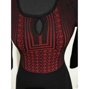 In excellent condition, has stretch to fit bust size. Elevate your wardrobe with this stunning Olive & Oak sweater dress. The dress features a beautiful striped pattern in red and black, perfect for adding a pop of color to your outfit. The 3/4 sleeves and keyhole neckline add a touch of elegance to the knee-length dress. The pullover closure and fit & flare style make it comfortable and flattering for any occasion. Made from high-quality knit fabric, this dress is sure to become a staple in your wardrobe.