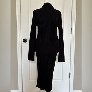 This elegant black ribbed knit dress offers a sleek and sophisticated look. Perfect for any occasion, its timeless design ensures you stand out with style. No flaws. Length is approximately 41 inches. Freshly laundered.