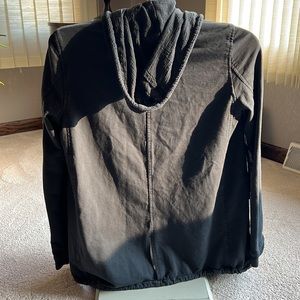 It has a hood that can be worn close to the neck for a more drappy look in the front - see pictures. It has a cute cut out at the bottom in the back. See pictures. Hard to part with this one. Brand new condition.