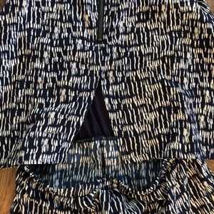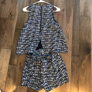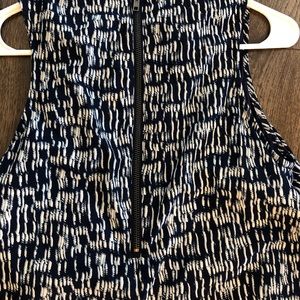 Navy and white printed romper- adorable, super flattering! Little cutout in the back- fun zipper detail! Looks great layered with denim jacket
