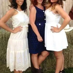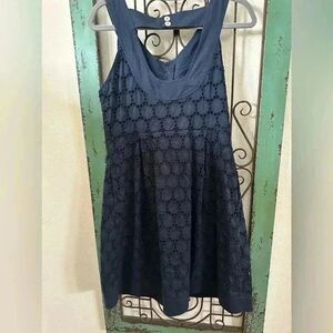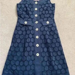 Navy Borderie Anglaise Dress with button up front. Contrast cream buttons. Cut out back detail. Well cared for.