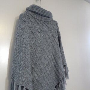 Olive & Pique Grey Cable Knit Sweater Poncho Fringe Trim Mock Turtle Neck Cloak