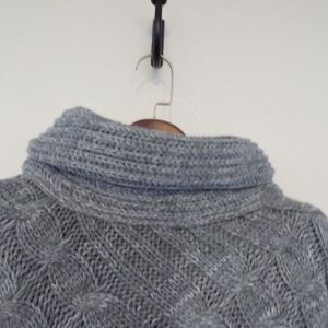 Grey Cable Knit Sweater Poncho Fringe Trim Mock Turtle Neck Cloak | OS