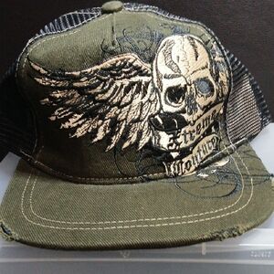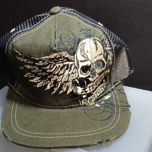 Stand out with this olive trucker hat featuring a striking skull embroidery. Perfect for adding an edgy touch to your outfit.