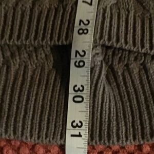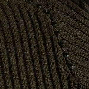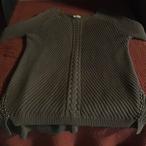 Ladie’s Size 1X. This thick, ribbed knit sweater is super cute on! Round neck, longer in back than front. Antique brass studs from collar down. The color is a light Olive, perfect for a cool Fall night. Front length is 27”, back length 31”. Pit to pit 22”. Sleeve length (from collar to end) 29”. The studs in the back curve toward the front at the bottom, creating a slimmer look. It is in great pre-owned condition, normal wear. Ladies size 1X. NOTE: some pics have light spots, these are sun reflections only. There are no discolorations at all on this sweater.