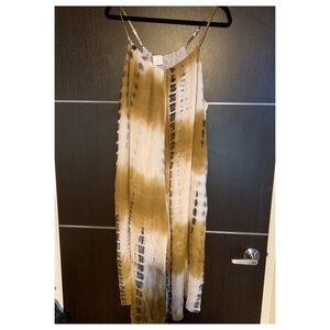 Beautiful Olive multi colored tie dye jumpsuit featuring spaghetti straps that are fully adjustable. This jumpsuit also has pockets on each side and is Capri length with gauchos, wide legs that flare out; perfect for Spring & Summer, and going into fall. The coloring came out spectacular! The jumpsuit is lined up to the hips, it’s 100% Rayon & the lining is as well.