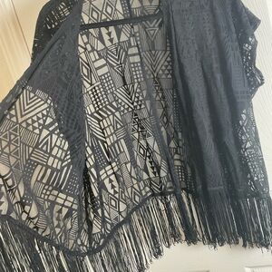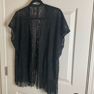 Stylish black kimono cardigan with fringe detailing. Perfect for layering.