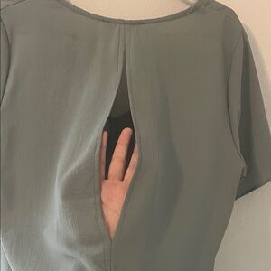 Chic olive blouse with a flattering V-neck. Features stylish ruffle hem. Perfect for versatile wear. Size large.