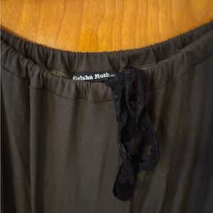 Olive green circle hip skirt with black lace ruffles. Lots of material and volume that give so much movement when you spin. Perfect for layering. Lace tie waistband can easily fit size S-L. I used for belly dancing but this piece is so versatile there’s so many options. Looks extra cute when you pull up and tuck the fronts of the skirt for extra layers. See last pic for example. Truly a gorgeous piece. 💖