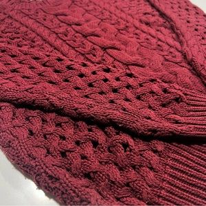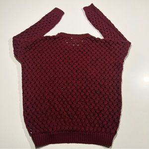 Olive and oak size large! Striking burgundy color. Great statement piece. The open knit is airy yet warm and could be a versatile piece practically year round. Super cute chunky knit design.Flattering neckline, right between a crew and a scoop neck.