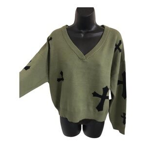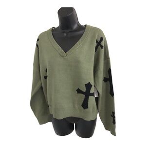 Olive army green v-neck black cross printed long sleeve sweater size XL new