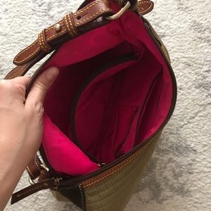 Olive green nylon Erica shoulder hobo tote bag from Dooney & Bourke with a brown leather strap. Top trimmed with dark brown suede. Inside is a hot pink nylon fabric. The purse measures 9 inches tall, 12 inches wide, and 7 inches deep. One inside zip pocket. Four inside pockets. Center zip divider pocket. Cell phone pocket. Top zipper closure. Adjustable strap. Strap drop length of 9 inches. Some minor markings with use & ink stain in the interior, but otherwise in great condition!