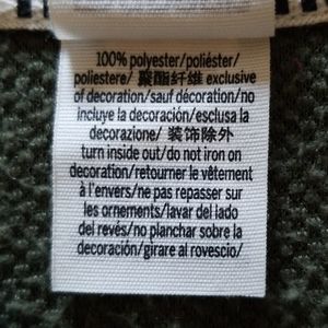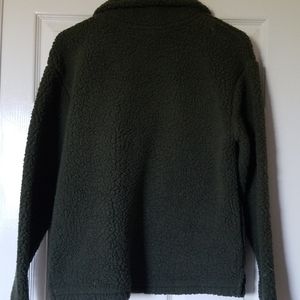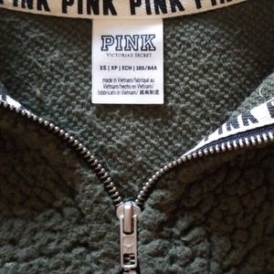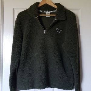 PINK by Victoria's Secret olive green fleece long sleeve pullover. 2 side pockets. Side slits. Stain on front as shown on pic 5. I have not tried to wash it as it may come out. Sleeves has a black band.