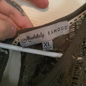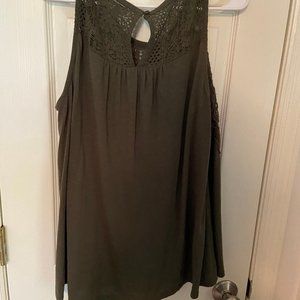 Olive green sleeveless shirt with lace detailing. Brand: Absolutely Famous. Size: XL. 65% polyester, 35% rayon // 75% cotton, 25% nylon. Smoke free home.