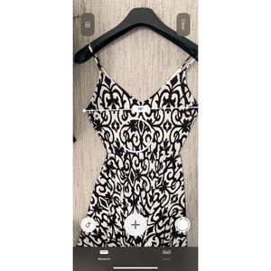 Keywords: Olive tree, mini dress, sleeveless, black dress, geometric pattern, summer dress, casual dress, V-neck, adjustable straps, flared skirt, machine washable, pre-owned, women's fashion, pullover dress, strappy sleeves.