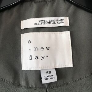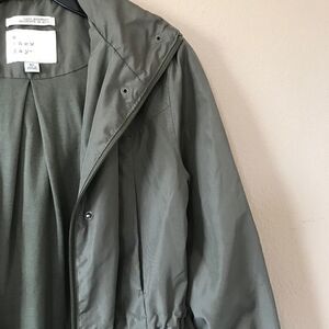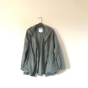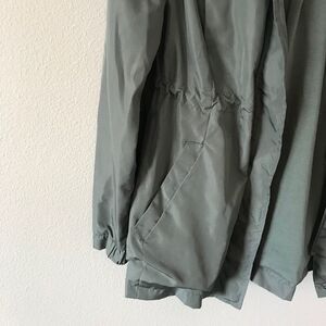 Olive green water resistant jacket in great condition! Size XS. Comes w/ hood. Button and zipper closures. With pockets. Cinches at the waist.