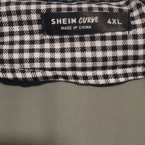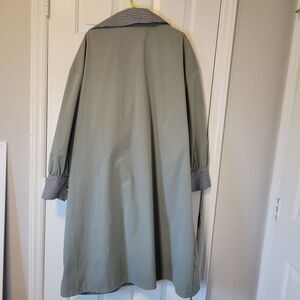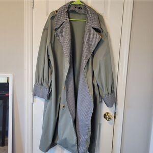 "Upgrade your fall wardrobe with this stylish olive green double-breasted trench coat. Adorned with black-and-white buffalo plaid cuffs and tortoise shell buttons, this all-weather coat is perfect for any occasion. Gently used and in excellent condition, it’s a must-have addition to your collection. This plus-size 4X coat offers both comfort and elegance. Don't miss out on this great deal!"