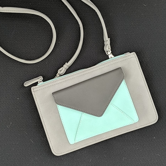 Crossbody bag with zip closure. Three inner sections plus an envelope pocket on the front. Removable strap. Lightly used. Vegan faux leather.