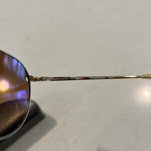 Gold Rimmed, Wire Frame Aviator Sunglasses from Oliver Peoples. The glass in the frame is brown tone that has a slight gradient from the top to bottom. Super comfy, they have adjustable silicon nose rests and rubber ends of the sides that nicely hug your head above the ear. In very good shape. Pre-worn with love. These glasses are timeless but with a bit of style that elevates them from the everyday aviator.