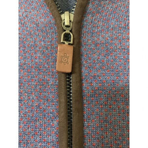 The blue, purple, and red colors give the sweater a stylish and trendy look, while the zipper and logo accents add a touch of uniqueness. The sweater is available in size L and is a regular fit. It is a pullover style sweater with a 1/4 zip feature. This sweater is perfect for walking, hiking, or playing golf.