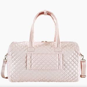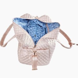 Beautiful, with a charming interior lining, lightweight, machine washable, duffel with crossbody strap and enough pockets and compartments to provide ultimate organization.