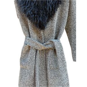 Material: Wool-blend tweed, lined interior, faux-fur collar, tie belt.