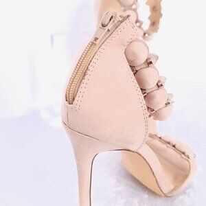 Olivia Ferguson Tan Microsuede 4.5 Inch Stiletto Open Toe Shoe, Pompom Ankle Strap Embellishments With Metal Studs Size 7.5
