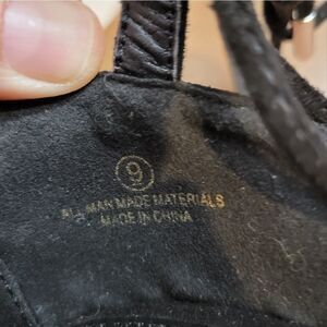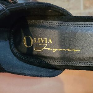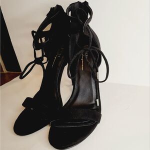 olivia Ferguson Black Suede Ankle Strap Heels! suede shapes a peep toe upper and structured heel cup featuring cutouts, tying laces (with gunmetal aglets), and a 3" back zipper.4" wrapped stiletto heel.Lightly cushioned insole.