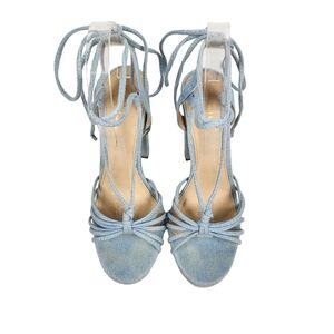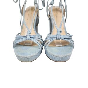 Olivia Ferragamo Hoover Light Powder Blue Denim Fabric Tie Platform Block Heels Sandals Women's Size 6.5