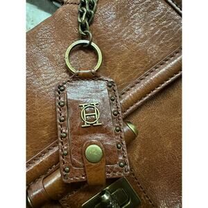 Beautifully aged Olivia Heather Genuine Leather Satchel Bag in a rich cognac brown tone. Crafted from high-quality genuine leather with natural distressing that adds authentic vintage charm. Features a single top handle, a detachable chain shoulder strap, and a secure front turn-lock closure. The interior shows a few minor stains on the lining consistent with age and use, but the structure remains strong and stylish. Similar in silhouette and craftsmanship to the Coach Chelsea Bag, this timeless piece pairs perfectly with both casual and elevated looks.