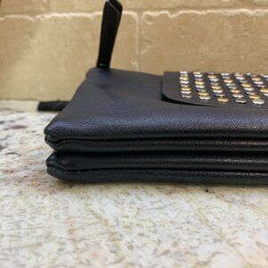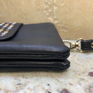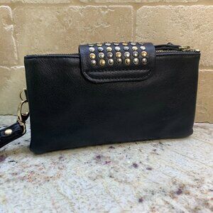 Beautiful leather in black with gold / silver stud cover wristlet with 3 compartments. Two zippered pockets and one single pocket. Interior is cloth with card slots, easy magnetic closure. Very gently used. Measures approximately 7 3/8" x 4". From a non-smoking home. Black wristlet strap is removable.