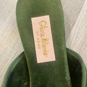 Beautiful Olivia Morris designer slippers in green velvet. Barely worn, excellent condition. Retail for $395. Too small for me unfortunately, best fit size 7.