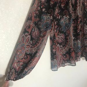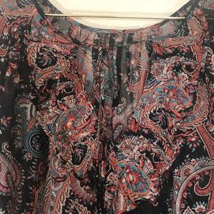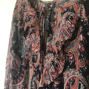 Item: Sheer silk paisley print balloon sleeve top with back ruffle tie detail. Stunning piece that pulls boho, but also is very elegant