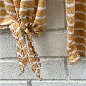 This long sleeve top is the perfect match with your dark leggings or jeans! The fabric is so soft, is mustard with white stripes and has tie at bottom. In excellent used condition. Listing is for top only.