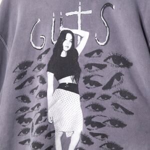 Olivia Rodrigo GUTS Tour sweatshirt in purple with bold graphic print and oversized fit. Women’s size L. Soft cotton blend construction delivers comfort while channeling Gen Z energy and grunge revival styling, perfect for fans and collectors.