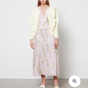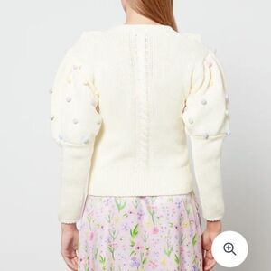 Pom-pom ruffled cardigan from Olivia Rubin featuring cream white, multicolour, cotton, knitted construction, pompom detail, ruffled detailing, front button fastening, round neck, long sleeves, ribbed hem and ribbed cuffs.