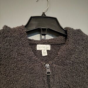 Cozy black sweater by Olivia Sky. Features a zip-up front and soft texture.