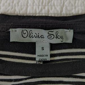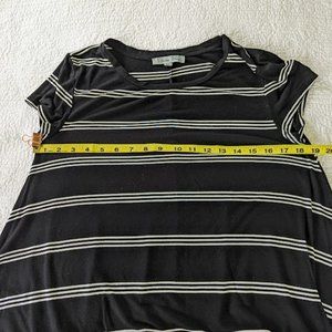 Short sleeve tunic top by Olivia Sky. Black with white stripes, cap sleeves. Soft fabric, loose, flowy fit. Rayon and machine washable. Size small with flat lay measurements of 19" pit to pit and 30" length. EUC with no wear, tears or stains.