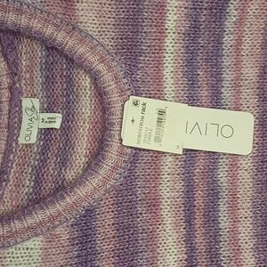 NWT Olivia Sky Drop Shoulder Sweater with Fringe in Pink, Purple, and White. 74 Polyester and 26 Acrylic.