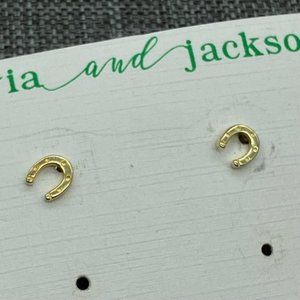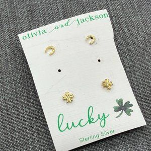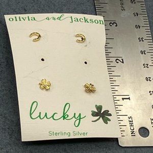 Olivia and Jackson brand, 2 pairs St. Patrick’s Day sterling silver stud earrings set, goldtone finish, detailed horseshoe and shamrock clover, one pair is missing from card, otherwise in like-new condition!