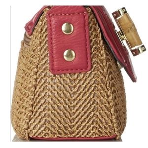 Straw like design and texture with fuschia faux leather and gold hardware. 9.8"L x 4.6"W x 7.5" H. Strap is approx 23 inches long. Can be worn as shoulder bag or crossbows. NWOT.