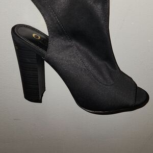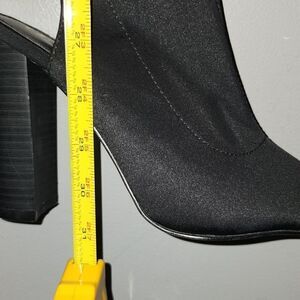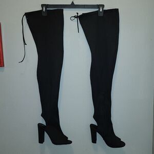 Black over the knee boot has inner zipper and drawstring in back 4 inch heel micro fiber